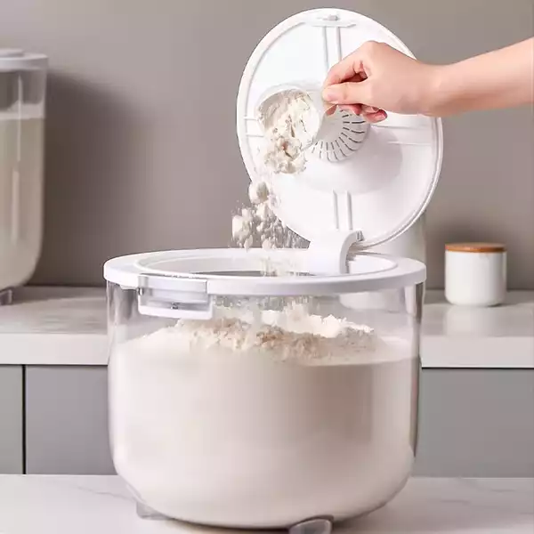 Nó được sử dụng đa năng, không chỉ thùng đựng gạo mà còn có thể đựng ngũ cốc như ngũ cốc, bột mì, thức ăn cho vật nuôi, các loại hạt, dược liệu,… Với cốc đo lường, việc kiểm soát lượng gạo sẽ dễ dàng hơn và bạn không cần lo lắng lãng phí thêm thức ăn
